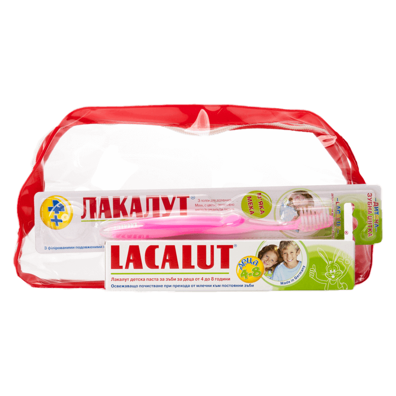 Комплект четка + паста Лакалут за деца от 4 до 8 години. Съобразен с нуждите на тази възраст. Четката е с меки снопчета косми и с цветно поле, върху което да се дозира точно съдържанието на пастата. В брандирано несесерче.
