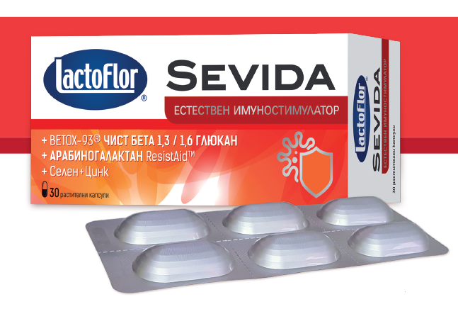LactoFlor SEVIDA комбинира патентованите формули: Betox-93 -93% чист бета 1,3 / 1,6 глюкан, най-чистият и бързо усвоим бета глюкан, извлечен от органични медицински гъби и ResistAid, който е натурален и чист арабиногалактан от американска лиственица.