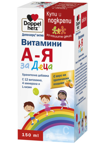 Сиропът Допелхерц® актив Витамини А-Я за Деца е пълноценна комбинация от 12 витамини, 4 минерала и незаменимата аминокиселина L-лизин, която подкрепя съпротивителните сили на организма и подпомага здравословния растеж и развитие в ранна детска възраст. Ежедневният прием на Допелхерц® актив Витамини А-Я за деца може да бъде полезен в периодите на постоянен растеж, през есенно-зимния сезон и при повишен стрес и умора. Допелхерц® актив Витамини А-Я за Деца е с приятен вкус на тропически плодове!