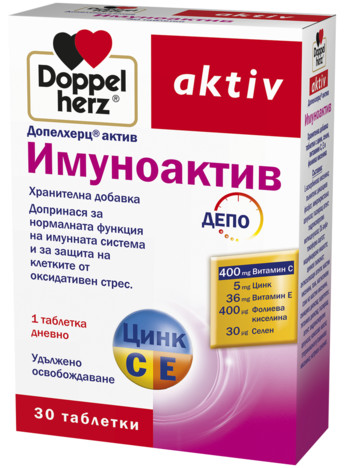 Допелхерц актив Имуноактив за здраве, енергия и силен имунитет. За по-силен имунитет и антиоксидантна защита. При умора и отпадналост (по време и след боледуване). При интензивен спорт и физическо натоварване. ДЕПО таблетка - удължено освобождаване на съставките.