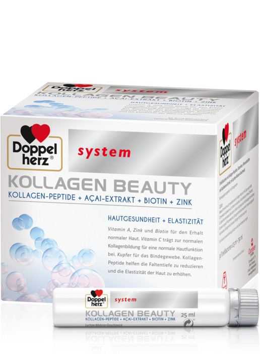 Допелхерц® систем Колаген Beauty е специално разработена комбинация от колагенови пептиди, екстракт от асай бери, витамини, минерали и микроелементи за гладка, еластична и красива кожа.