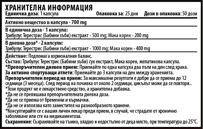 Препоръчителна дневна доза: Приемайте по 1 капсула два пъти на ден след хранене.трибулус с мака