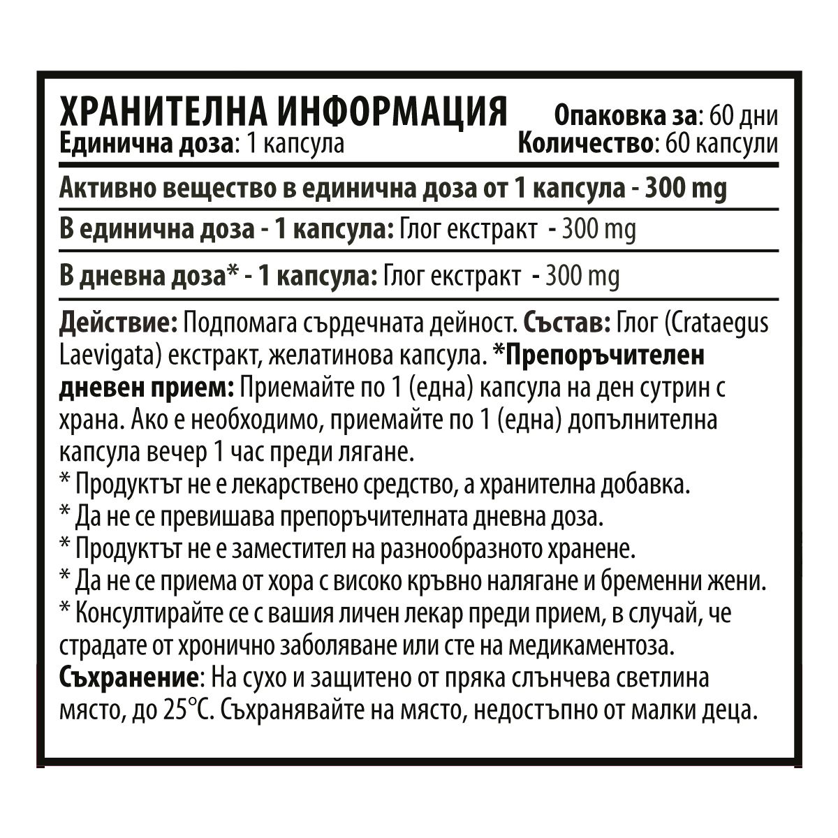 Количество в единична доза - 1 капсула: Глог екстракт - 300 mg