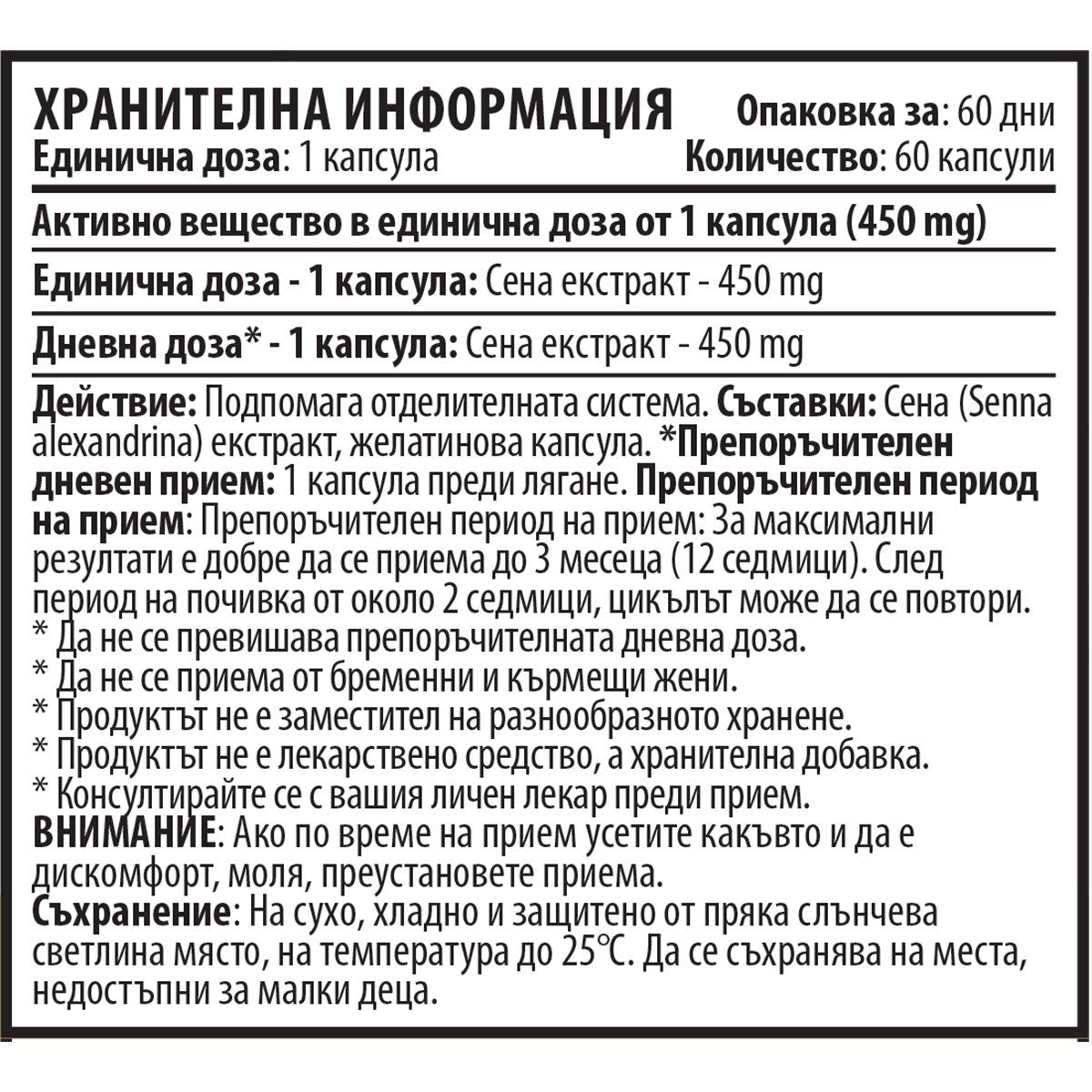 Съставки: Сена (Senna alexandrina) екстракт, желатинова капсула.