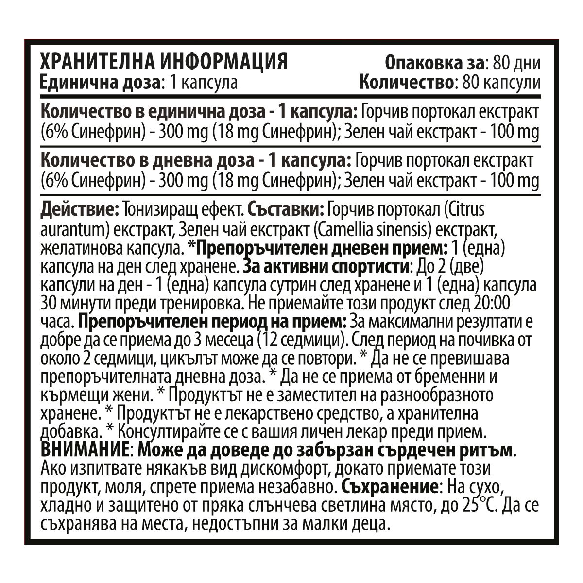Горчив портокал екстракт (6% Синефрин) - 300 mg (18 mg Синефрин); Зелен чай екстракт - 100 mg