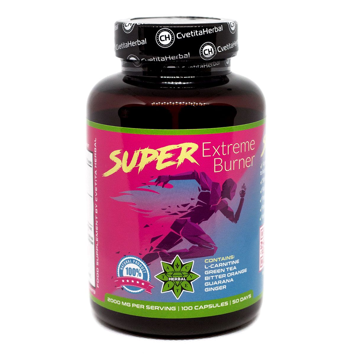 Super Extreme Burner е комбинация от Л-Карнитин тартрат, екстракт от Горчив Портокал (6% Синефрин), екстракт от Гуарана (22% кофеин), Джинджифил и екстракт от Зелен чай. Super Extreme Burner е продукт, който е разработен по специална технология от висококачествена суровина съчетаваща ценни биологично активни съставки.