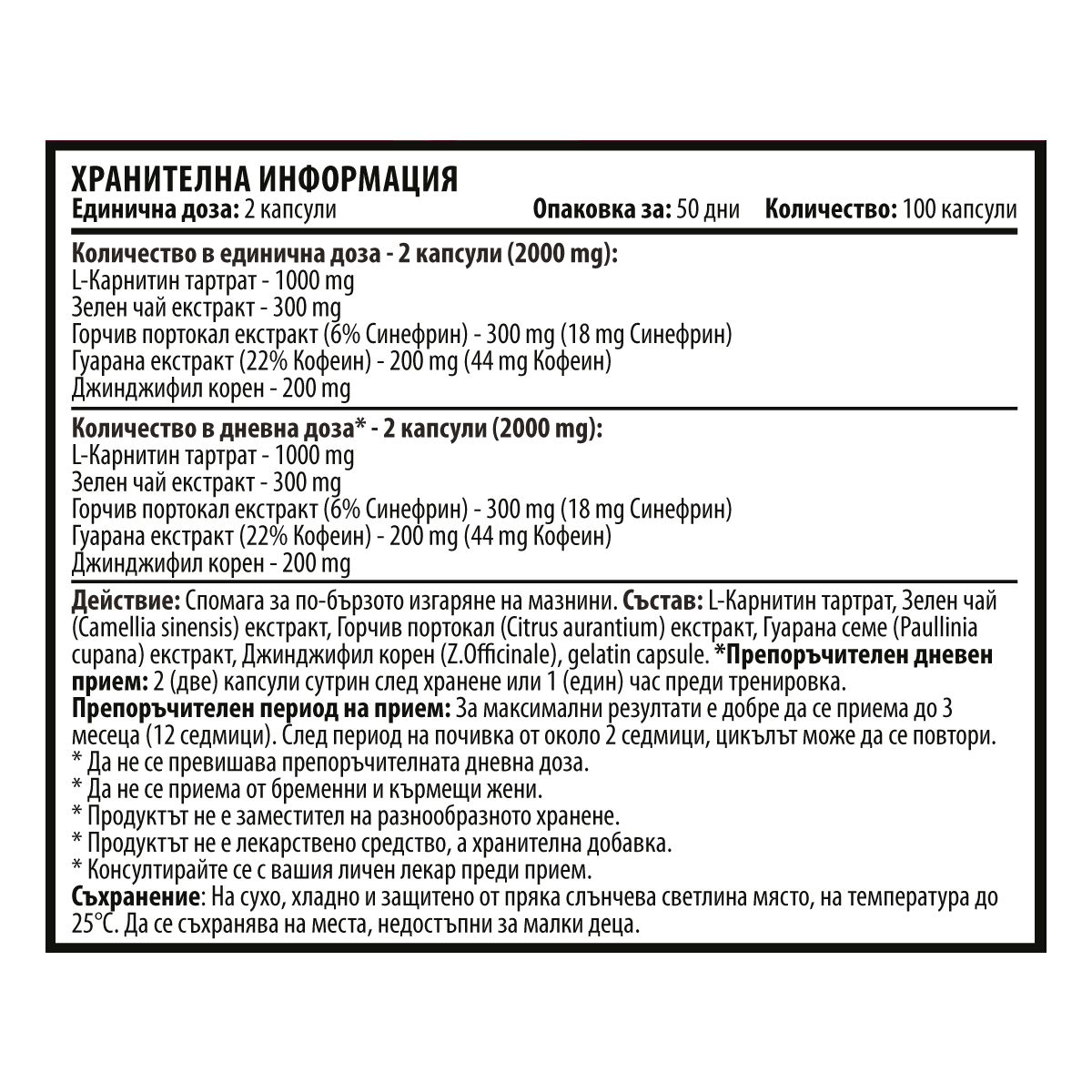 Състав: L-Карнитин тартрат, Зелен чай (Camellia sinensis) екстракт, Горчив портокал (Citrus aurantium) екстракт, Гуарана семе (Paullinia cupana) екстракт, Джинджифил корен (Z.Officinale), gelatin capsule.