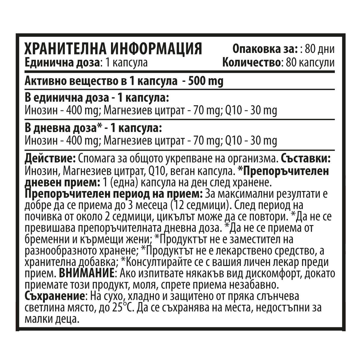 Съставки: Инозин, Магнезиев цитрат, Q10, вегетарианска капсула.