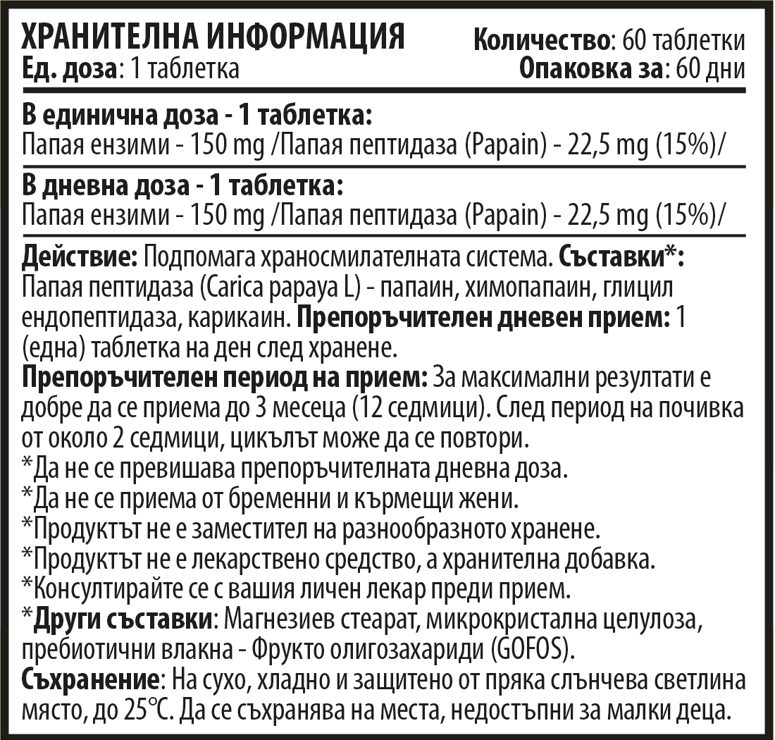 Папая ензими - 150 mg /Папая пептидаза (Papain) - 22,5 mg (15%)/