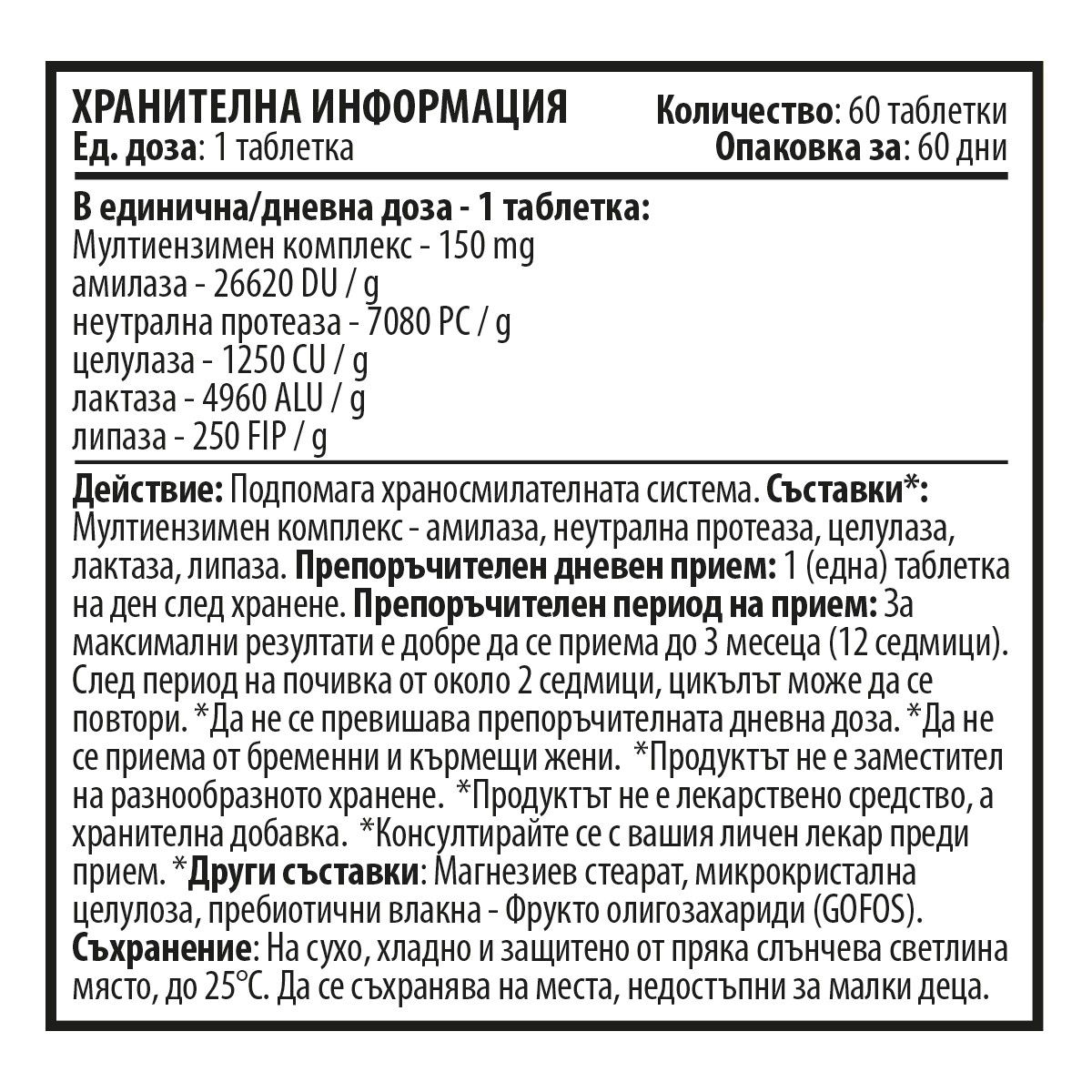 Съставки*: Мултиензимен комплекс - амилаза, неутрална протеаза, целулаза, лактаза, липаза.