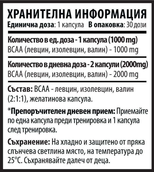 Състав: BCAA - левцин, изолевцин, валин (2:1:1), желатинова капсула.