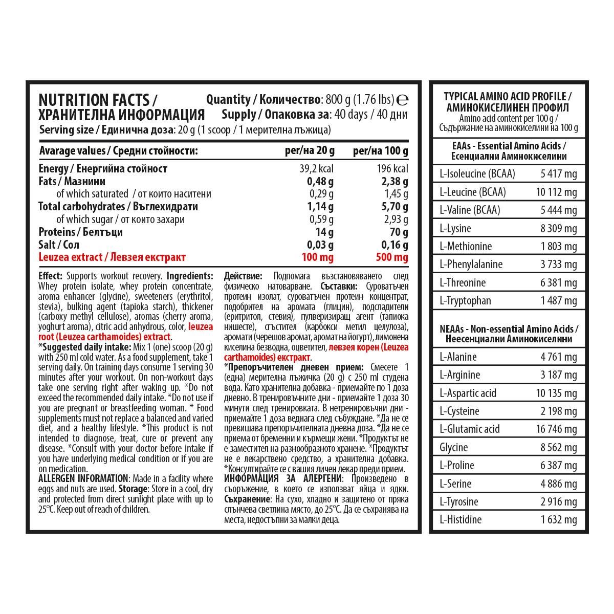 Съставки: Суроватъчен протеин изолат, суроватъчен протеин концентрат, подобрител на аромата (глицин), подсладители (еритритол, стевия), пулверизиращ агент (тапиока нишесте), сгъстител (карбокси метил целулоза), аромати (черешов аромат, аромат на йогурт), лимонена киселина безводна, оцветител, левзея корен (Leuzea carthamoides) екстракт.