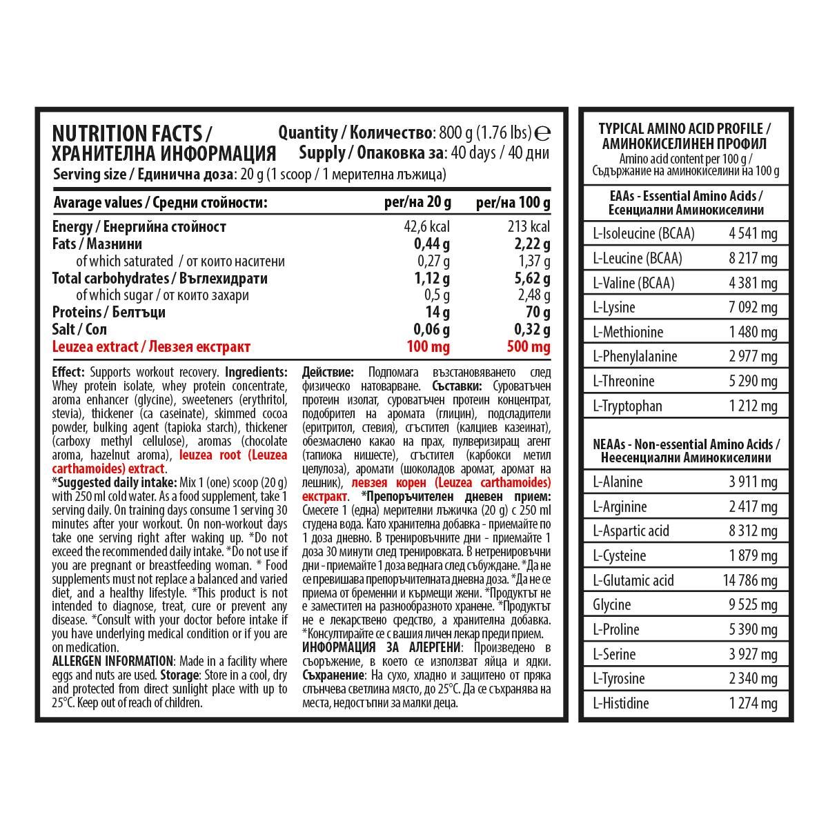 Съставки: Суроватъчен протеин изолат, суроватъчен протеин концентрат, подобрител на аромата (глицин), подсладители (еритритол, стевия), сгъстител (калциев казеинат), обезмаслено какао на прах, пулверизиращ агент (тапиока нишесте), сгъстител (карбокси метил целулоза), аромати (шоколадов аромат, аромат на лешник), левзея корен (Leuzea carthamoides) екстракт.