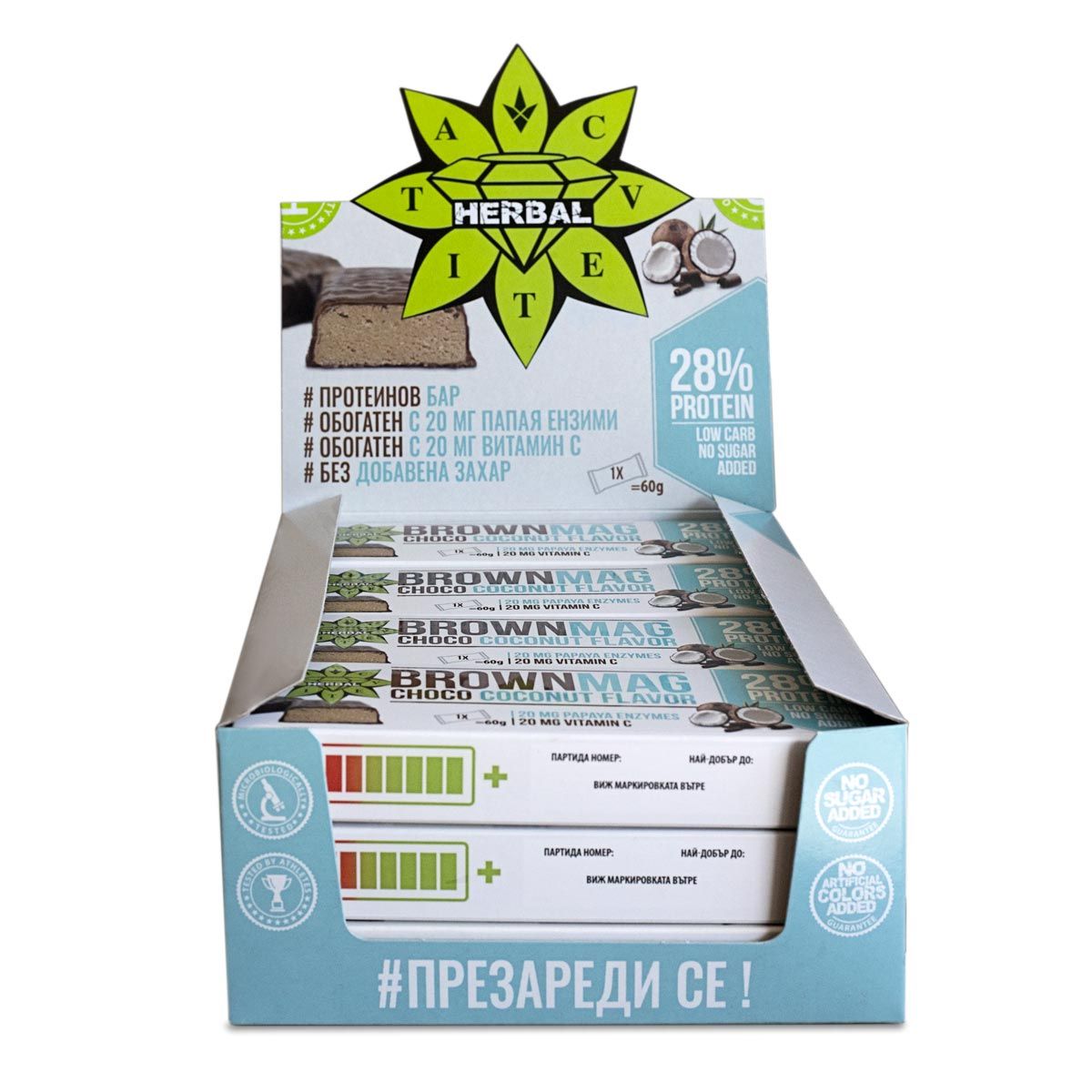 BrownMag Кокос е сред новите ни вкусни предложения, които съчетават разнообразие от ценни и напълно натурални съставки в една опаковка. BrоwnMag Кокос е протеиново брауни, което е приготвено без добавена захар.