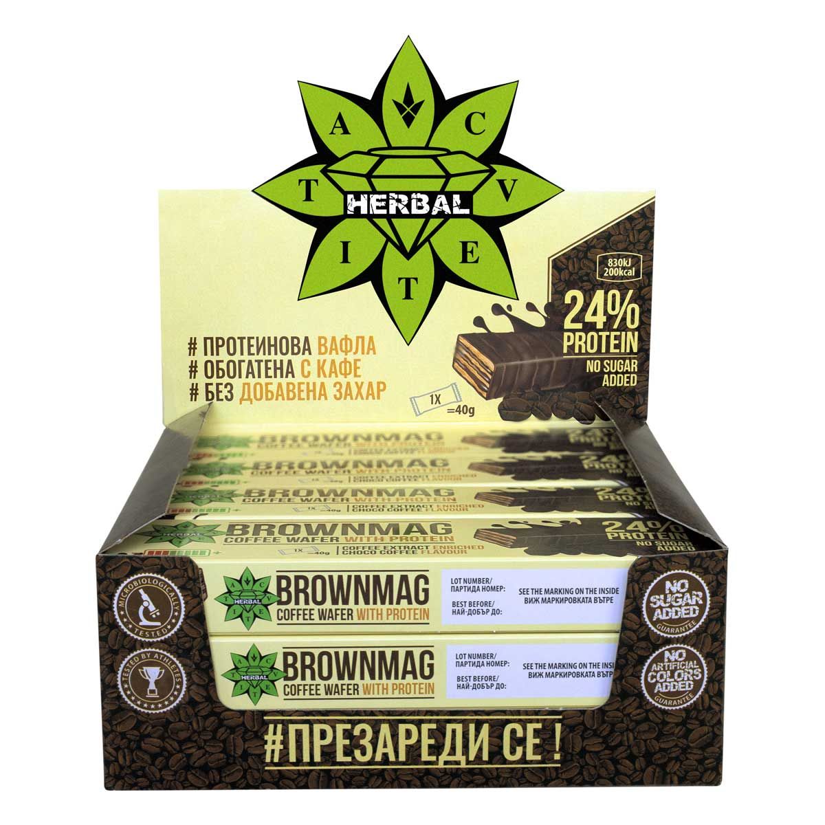 BrownMag Coffee e протеинова вафла приготвена в съчетание от качествата на напълно натурални продукти- кафе, кокосово масло и какао. BrownMag Coffee съдържа естествени подсладители и е без добавена захар.
