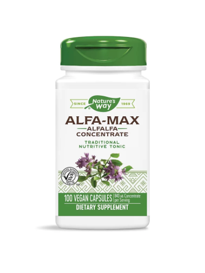 Патентован концентрат от люцерна Alfa-Max®, смесен с листа от люцерна! Богат източник на витамини и минерали, хлорофил, фибри и други фитонутриенти с широк спектър на действие! Предоставя уникални ползи за баланса на хормоните в женския организъм, отличен детоксикатор, разкрасява кожата и косата, поддържа нормалните нива на холестерола!