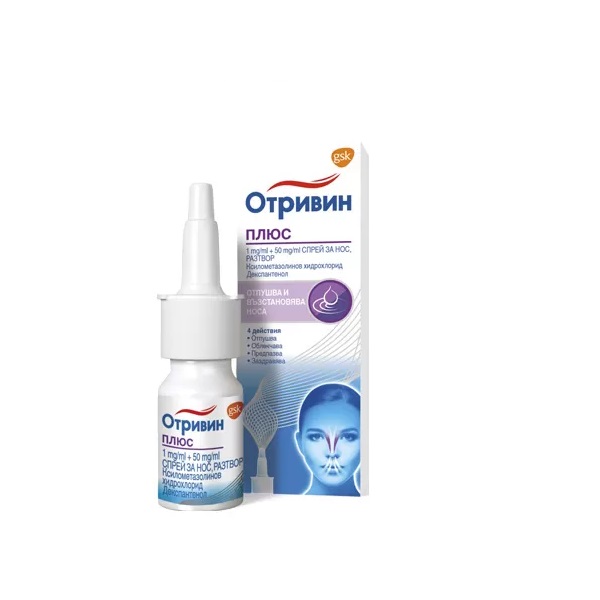 Отривин плюс съдържа активната съставка Ксилометазолин, която намалява подуването на носната лигавица и така облекчава симптомите на запушения нос, и Декспантенол – той спомага за заздравяване на раните и защитава лигавицата. Отривин плюс се използва за: намаляване на отока при ринит и като подпомагащо лечение за заздравяване на рани по кожата и лигавиците, за облекчаване на хремата и за третиране на запушен нос след операция на носа; намаляване на отока на носната лигавица при ринит, свързан с остро възпаление на синусите (риносинузит).