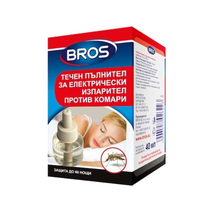 Течен пълнител за електрически изпарител на Брос е ефикасно средство в борбата с комарите и други летящи насекоми, влизащи отвън. Електрическият изпарител Bros действа дори при отворени прозорци и включено осветление. В комплекта е включен един течен изпарител.