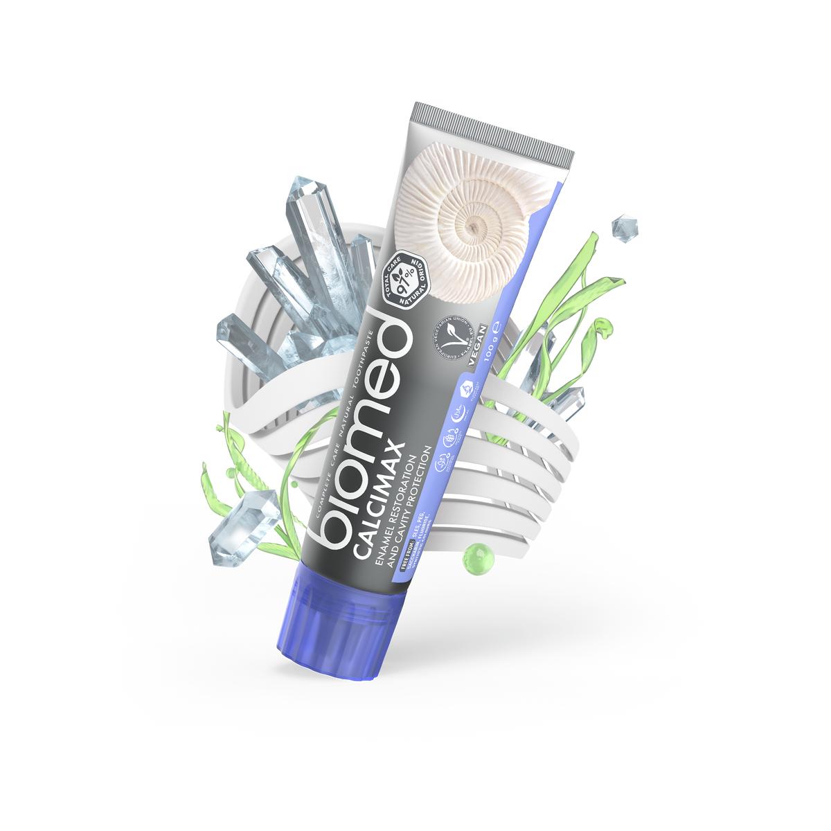 Пастата за зъби Biomed CALCIMAX е укрепваща със сол от древни морета и калциев хидроксиапатит за защита срещу кариес и ефективно реминерализиране на емайла.