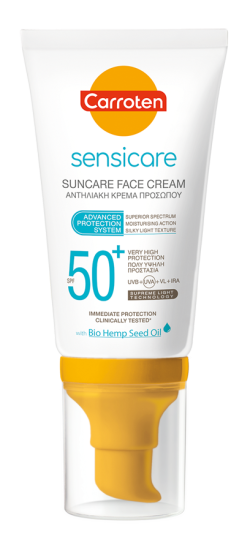 Слънцезащитният крем за лице Sensicare SPF50 + е с много висока и подобрена защита на кожата, насочена към най-големия спектър от всички слънчеви лъчи. Слънцезащитният крем Sensicare е обогатен с био конопено масло, осигуряващо дълготрайна грижа и защита на чувствителната към слънцето кожа. Неговият състав е разработен, за да сведе до минимум риска от алергични реакции.