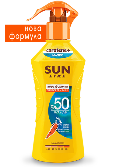 Слънцезащитно мляко Sun Like, с НОВА формула, без октокрилен и хомосалат. Доказано защитава здравето на кожата и се грижи за околната среда.