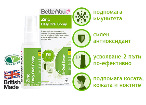 BetterYou Zinc Oral Spray Цинк 10мг спрей 50мл е специално формулирана цинкова добавка за поддържане на нормалната функция на имунната система, защита на клетките от оксидативен стрес и поддържане на здрави очи, нормална коса, кожа и нокти.