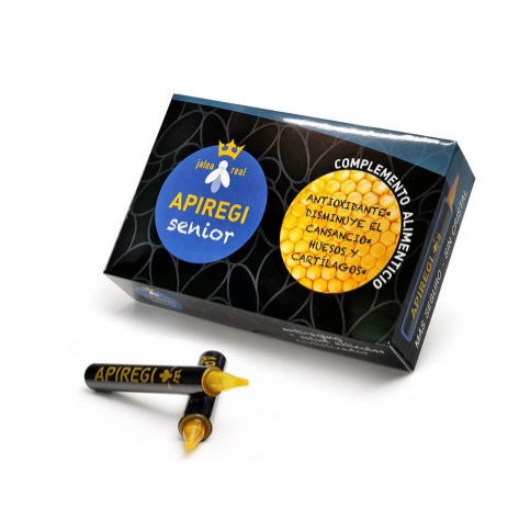 Jalea real Apiregi senior, ампули, е естествен продукт с гарантирано качество от испанската компания Artesania Agricola - лидер в производството на хранителни добавки от натурални източници. Пчелното млечице, основна негова съставка, е богато на протеини и незаменими аминокиселини, минерали и витамини: А, С, D, Е и витамини от В-групата (ВА, В2, В5, В6, В8 и фолиева киселина), като осигурява следните ползи: