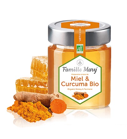 Miel et Curcuma Bio е вкусна смес от акациев мед и куркума с ефективно действие за подобряване здравето на ставите, стомашно-чревния тракт, кръвоносната система. Този висококачествен продукт, плод на иновациите на пчеларите от френската медоносна компания Famille Mary, е богат източник на: