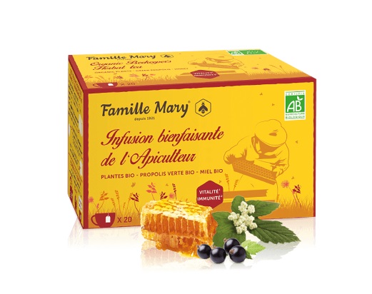 Ако чаят е част от ежедневния ви ритуал за жизненост и здраве, Infusion bienfaisante de l’Apiculteur на френската компания Famille Mary® е точно за вас. Ароматен и полезен, богат на ценни билки, рядък зелен прополис и био мед, той ще подсили обичайния ви ритъм на живот, като му придаде щипката свежест, от която се нуждаете. Може да го консумирате по всяко време, студен или топъл, а активните му съставки ще ви пренесат сред средиземноморския рай на провинция Аквитания, близо до Атлантическия бряг на Франция. Именно там, където природата е щедра и изобилна в даровете си, растителното богатство е високо оценено и е превърнато в синоним на френското bien-être – усещане за благополучие, което включва добро здраве и умение да живееш в хармония със себе си и другите.
