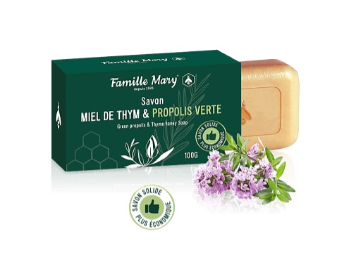 Истинска наслада за кожата – това е натуралният сапун Savon Miel de Thym and Propolis verte - Сапун с пчелен мед от мащерка и зелен прополис на френската медоносна къща Famille Mary®. Неговите изцяло естествени съставки включват два от най-добрите антибактериални агенти в природата – зелен прополис и мащерка (мед), а за подобряване структурата на кожата и нейното ревитализиране формулата на сапуна е подсилена с масло от ший и пчелно млечице.
