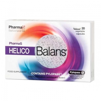 Хеликобаланс капсули е хранителна добавка, която съдържа Pylopass™ - инактивиран пробиотик Lactobacillus reuteri, който влияе благоприятно при гастрит, причинен от Helicobacter pylori. Свързва се с болестотворната бактерия в стомаха и се екскретира заедно с нея извън организма през храносмилателната система.