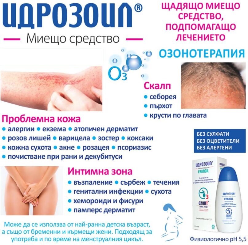 Идрозоил е иновативно миещо средство за ежедневно почистване и измиване. Идрозоил действа чрез озониди, които отделят активен кислород в тъканите. Това го прави едновременно ефективно и щадящо почистващо средство, подходящо и за най-уязвимите групи – бебета, бременни и възрастни хора.