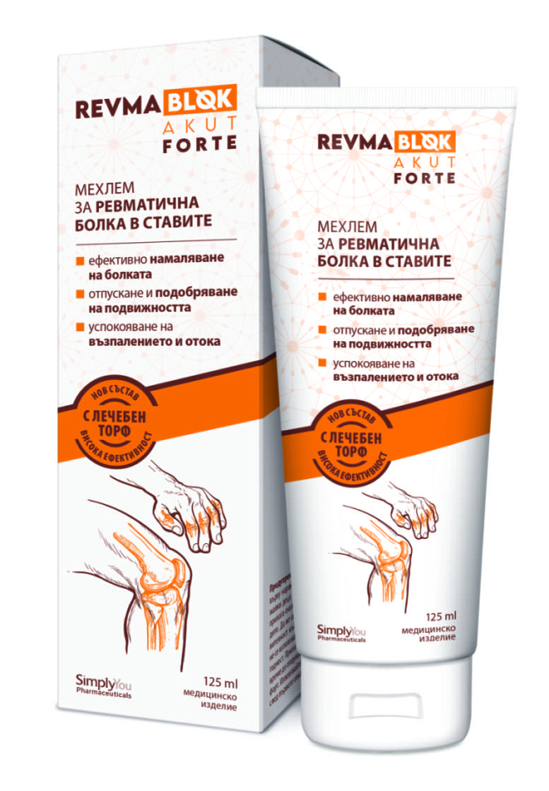 Ревмаблок акут форте е медицинско изделие, предназначено за масаж на болезнени и сковани стави с приятна и нелепкава текстура. Ефективно намалява симптомите на ревматични ставни заболявания като болка, скованост, изтръпване и мравучкане и подпомага регенерацията на ставите. Значително допринася за успокояване на възпалението и отока и подобрява подвижността на ставите. Подходящ е при ревматични болки в ставите, както и при дегенеративни ставни нарушения или претоварване на ставите. Ревмаблок акут форте съдържа лечебен торф и натурални екстракти от байкалски шлемник, розмарин, черен оман и босилек.