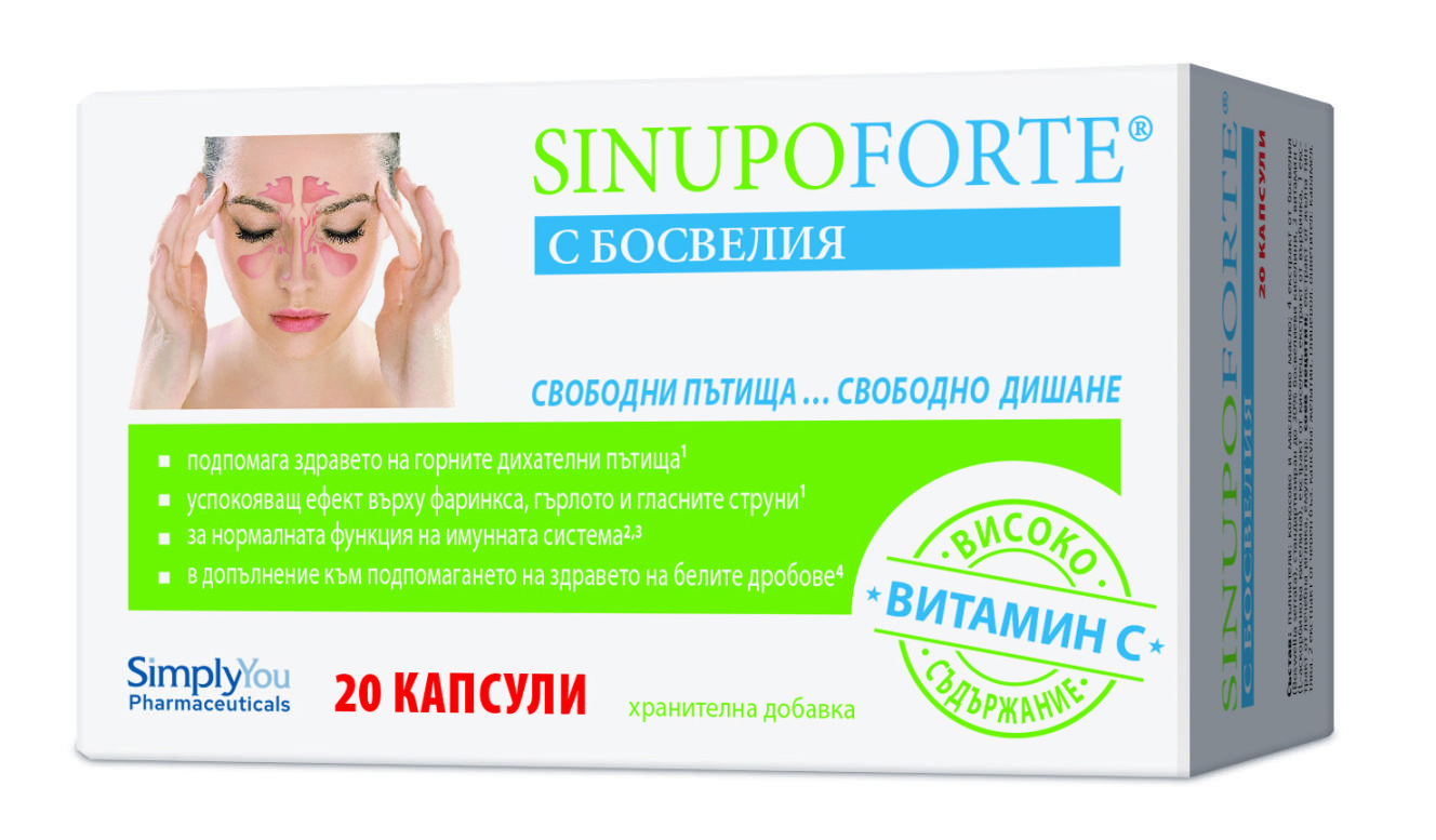 Синупо форте с босвелия е хранителна добавка с иновативна, билкова комбинация, която има мощен имуностимулиращ ефект, подпомага здравето и функцията на горните дихателни пътища, има успокояващ ефект върху болката във фаринкса, гърлото и гласните струни.