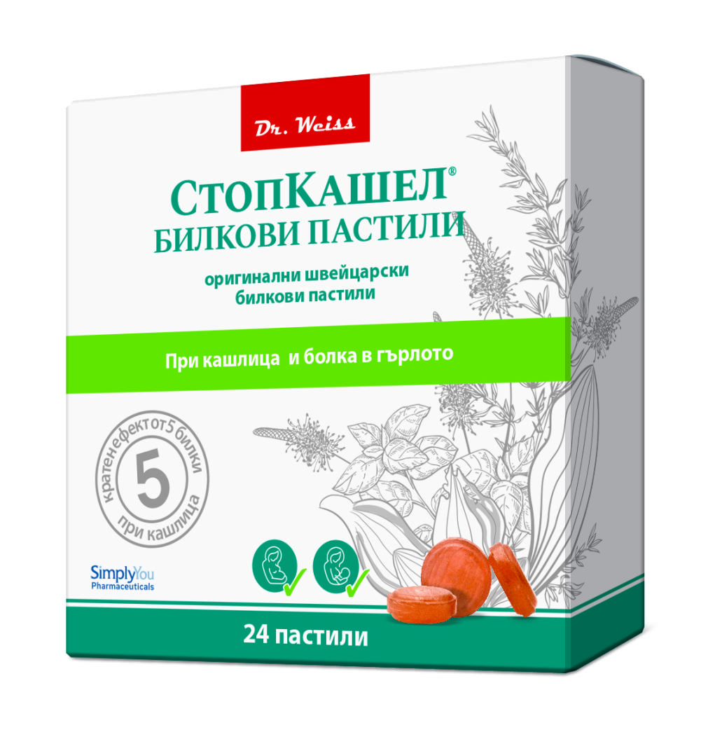 Стопкашел билкови пастили при кашлица и гърло е хранителна добавка, с уникална билкова смес от 5 билки (живовляк, босвелия, мащерка, босилек, евкалипт), които помагат за облекчаване на симптомите на често срещани простудни заболявания: