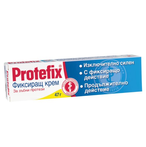 Protefix® Фиксиращ крем е оптимално решение на редица проблеми със задържането на зъбните протези. Protefix® Фиксиращ крем се препоръчва както при проблеми със задържането, така и при повишено отделяне на слюнка. Той е лесен за употреба, без вкус и не предизвиква неприятни промени в усещането за вкус и мирис на храни и напитки.
