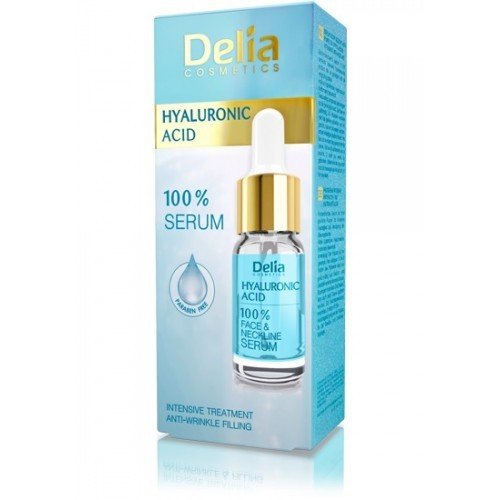 Увлажняваща терапия, подходяща за използване при всякакъв тип кожа. 100 % Serum Hyaluronic Acid от Delia Cosmetics притежава следните благотворни свойства: интензивно овлажнява кожата и запълва бръчките; изглажда и придава еластичност на кожата; препоръчва се като терапия за обезводнена и уморена кожа на въраст двадесет и пет+ години (използване нощем в продължение на един месец); често използване при възраст петдесет+ години – използване през нощта два пъти седмично; идеално подхожда за масаж на лицето; положителните ефекти се забелязват още след първото използване; шишенцето и снабдено с удобен апликатор.