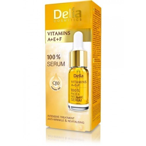Серум с витамини A + E + F за лицето и шията Delia Cosmetics, 10мл: серум за грижа за лицето и шията, с концентрирана формула, обогатена с витамини A, E и F, която осигурява на кожата хидратация и интензивно подхранване.