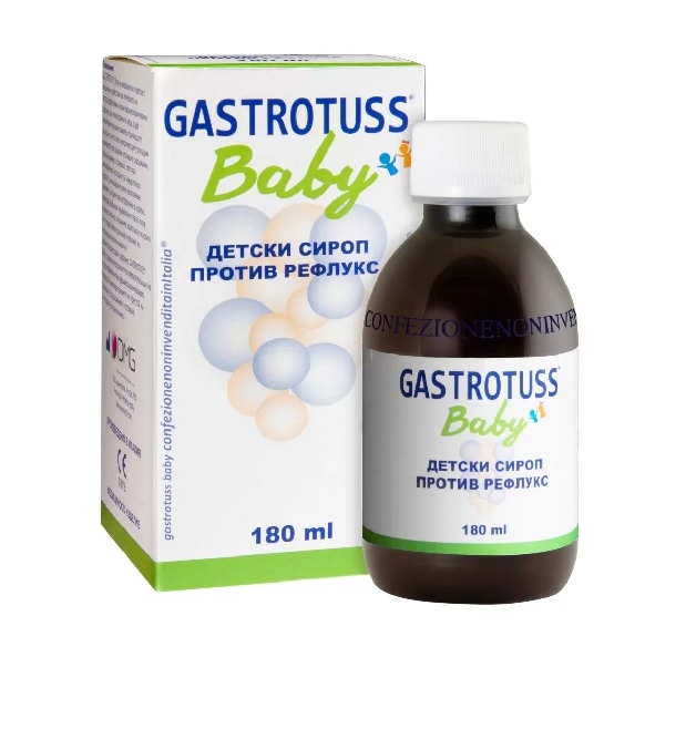 ГАСТРОТУС БЕЙБИ сироп Показания: Перорална суспензия с механично действие, подпомагащо лечението на стомашния рефлукс при новородени и деца. Намалява неприятната симптоматика (чести повръщания в резултат на рефлукс и повишени киселини в стомаха, кашлица, възпаление на хранопровода, възпаление на носоглътката) и във всички случаи на смущения, които като основна или спомагателна причина се дължат на стомашен рефлукс. За перорално приложение, не се резорбира в организма, няма метаболитни взаимодействия, не променя pH в стомаха. Подходящ за честа и продължителна употреба. Вкусово коригиран.