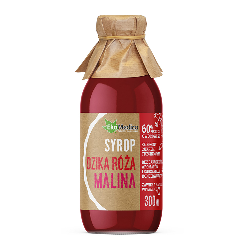 Syrop Dzika Roza Malina / Сироп от шипка и малина, 300 ml е хранителна добавка на EkaMedica, Полша. Продуктът подпомага дейността на имунната система. Шипките и малините съдържат витамини, минерали, антиоксиданти и растителни съединения, които играят важна роля за поддържането на здравето на различни органи и системи в човешкото тяло. Те са източник на витамини като С, А, Е, К и от група В, които са от съществено значение за поддържането на здравословното състояние на организма.