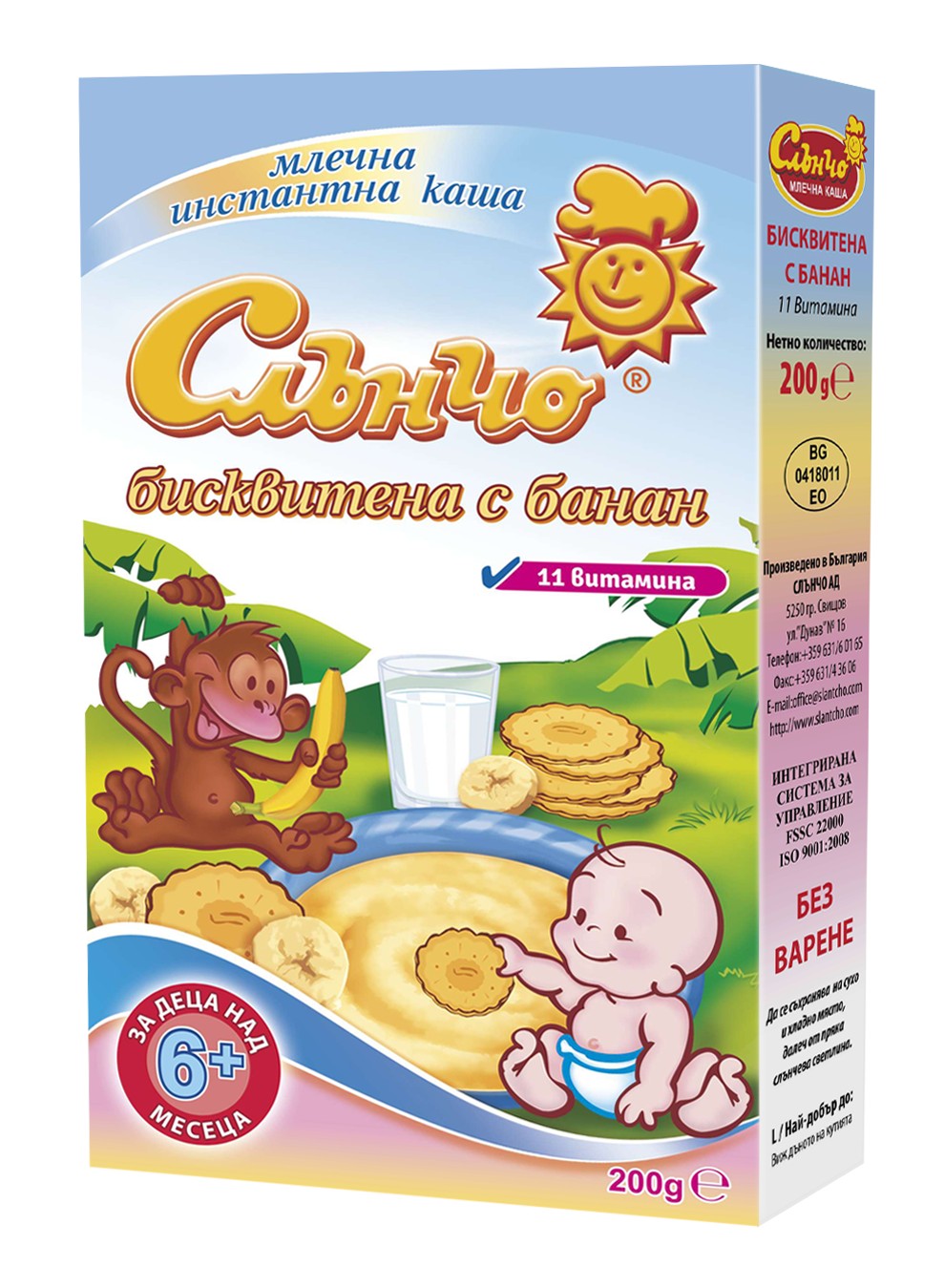 Слънчо бисквитена каша с банан е обогатена с 11 витамина и съдържа като естествени съставки незаменими аминокиселини, ненаситени мастни киселини и микроелементи, необходими за задоволяване на хранителните потребности на Вашето дете.