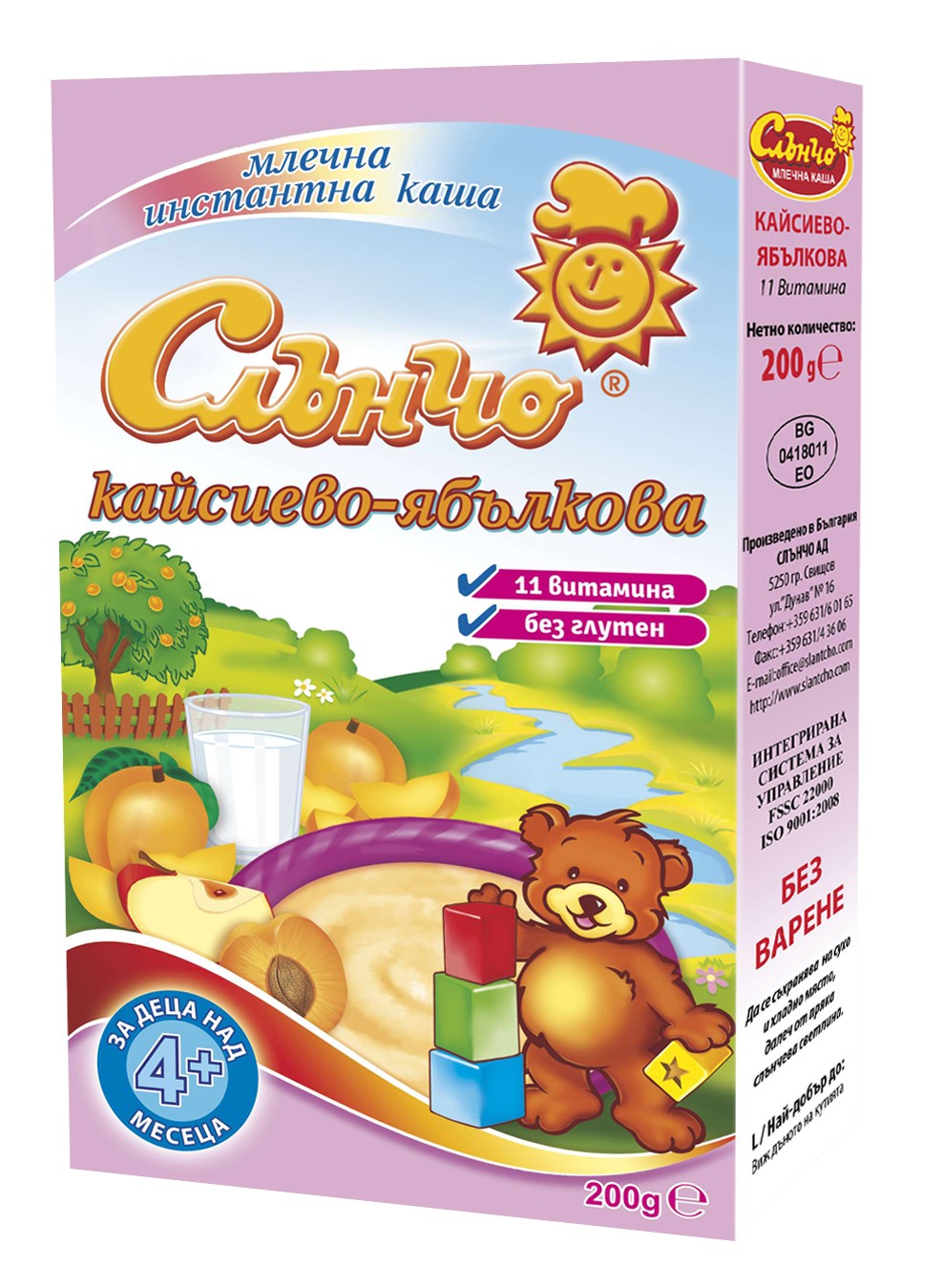 Кайсиево-ябълковата каша „Слънчо“ с посочения по-долу състав може да се открие в търговската мрежа до 27.09.2013. От месец януари 2013г. кашата се произвежда с безглутенов състав.