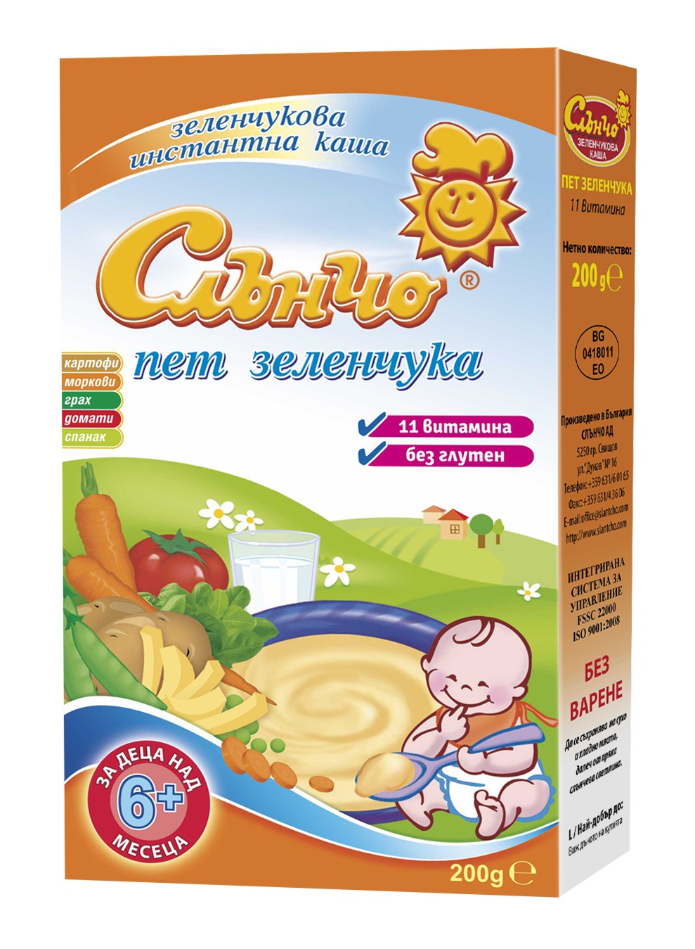 Състав: сухо пълномаслено мляко* (26,1%), оризово брашно, царевично нишесте,суха сладка суроватка*, картофено брашно (8,4%), грах (4,8%), захар, пюре от моркови (3,1%), пюре от домати (1,5%), спанак (1,3%), витаминна смес (Витамин А (ретинил ацетат), Витамин D3 (холекалциферол), Витамин Е (алфа токоферол ацетат), Витамин С (L-аскорбинова киселина), Витамин В1 (тиамин мононитрат), Витамин В2 (рибофлавин), Витамин В6 (пиридоксин хидрохлорид), Витамин В12 (цианокобаламин), Витамин В9 (фолиева киселина), Пантотенова киселина (калциев D-пантотенат)) и Ниацин (ниацинамид).