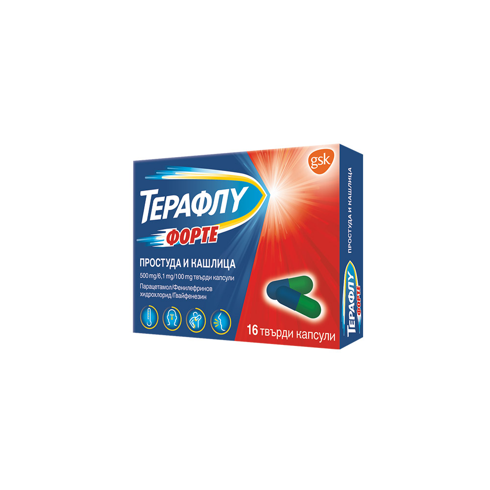 ТЕРАФЛУ ФОРТЕ ПРОСТУДА И КАШЛИЦА капсули х 16