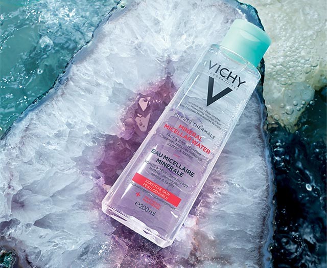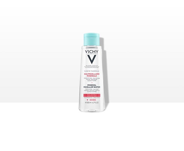 Мицеларна вода за чувствителна кожа, обогатена с Термална минерализираща вода Vichy и Пантенол с успокояващо действие.