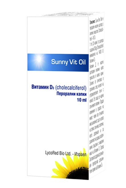Sunny Vit Oil е маслен разтвор със съдържание на активно вещество Витамин D3 на LycoRed Bio Ltd. – Израел.