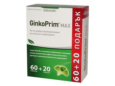 Приложение: За по-добро кръвооросяване на мозъка и крайниците. ГинкоПрим Макс съдържа 60 мг стандартизиран екстракт от Гинко билоба, който гарантира максимална ефективност при проблеми с паметта, концентрацията и кръвооросяването на крайниците. Положителните свойства на Гинко билоба се допълват и засилват от включения в продукта магнезий. Благодарение на тази уникална комбинация ГинкоПрим Макс е максимално ефективен, както за млади хора (подложени на умствено, психическо или физическо натоварване), така и за по-възрастни.