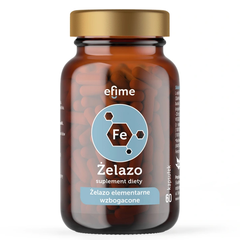 Efime Zelazo / Желязо + Витамин В6, В12, С, Фолиева киселина, 60 капсули е хранителна добавка на EkaMedica, Полша. Формулата допринася за нормалното образуване на червени кръвни клетки и хемоглобин.
